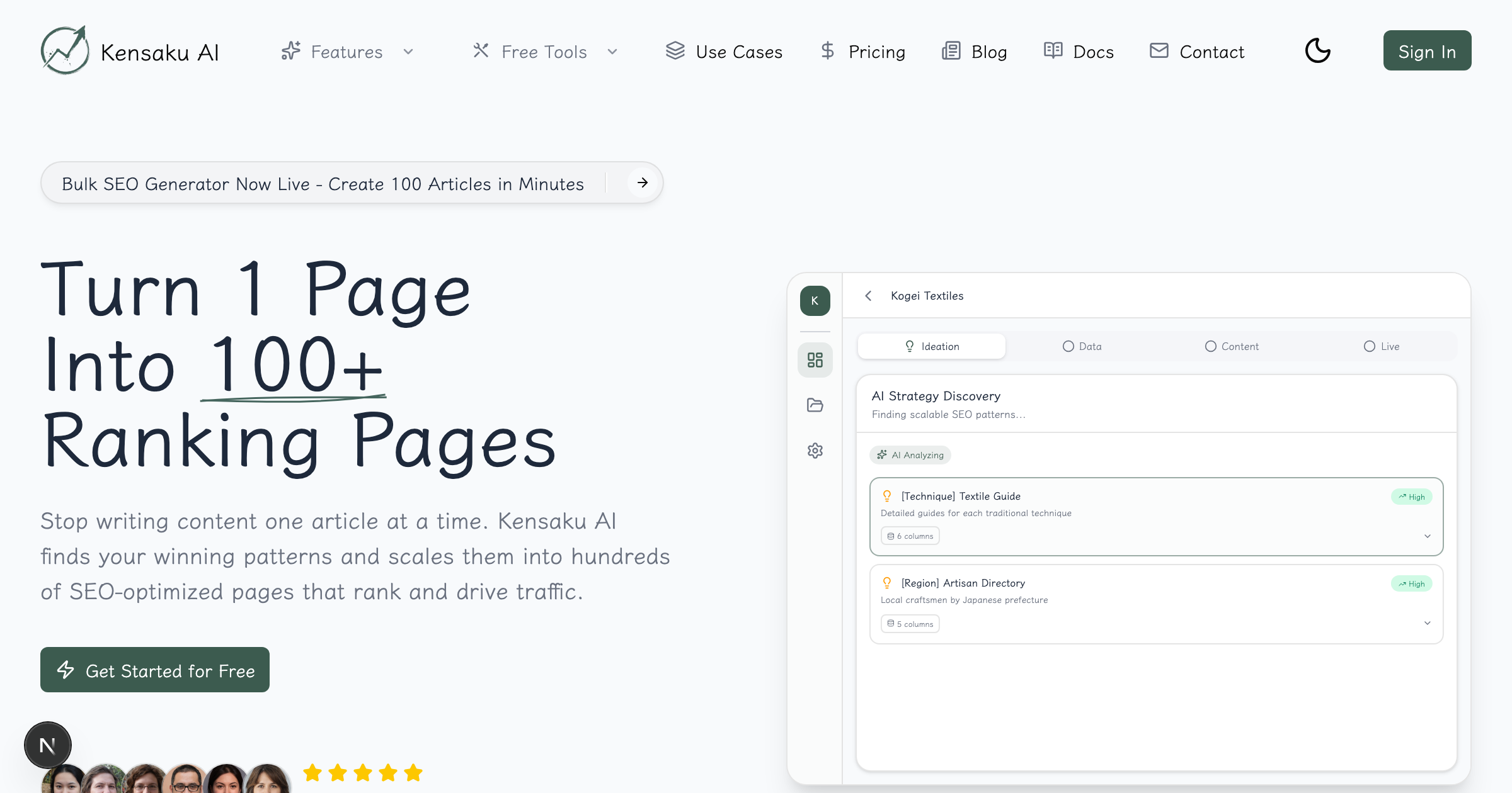 AI-powered strategy suggestions based on your niche. Automatic data specifications. Pattern detection that turns one ranking page into hundreds.
