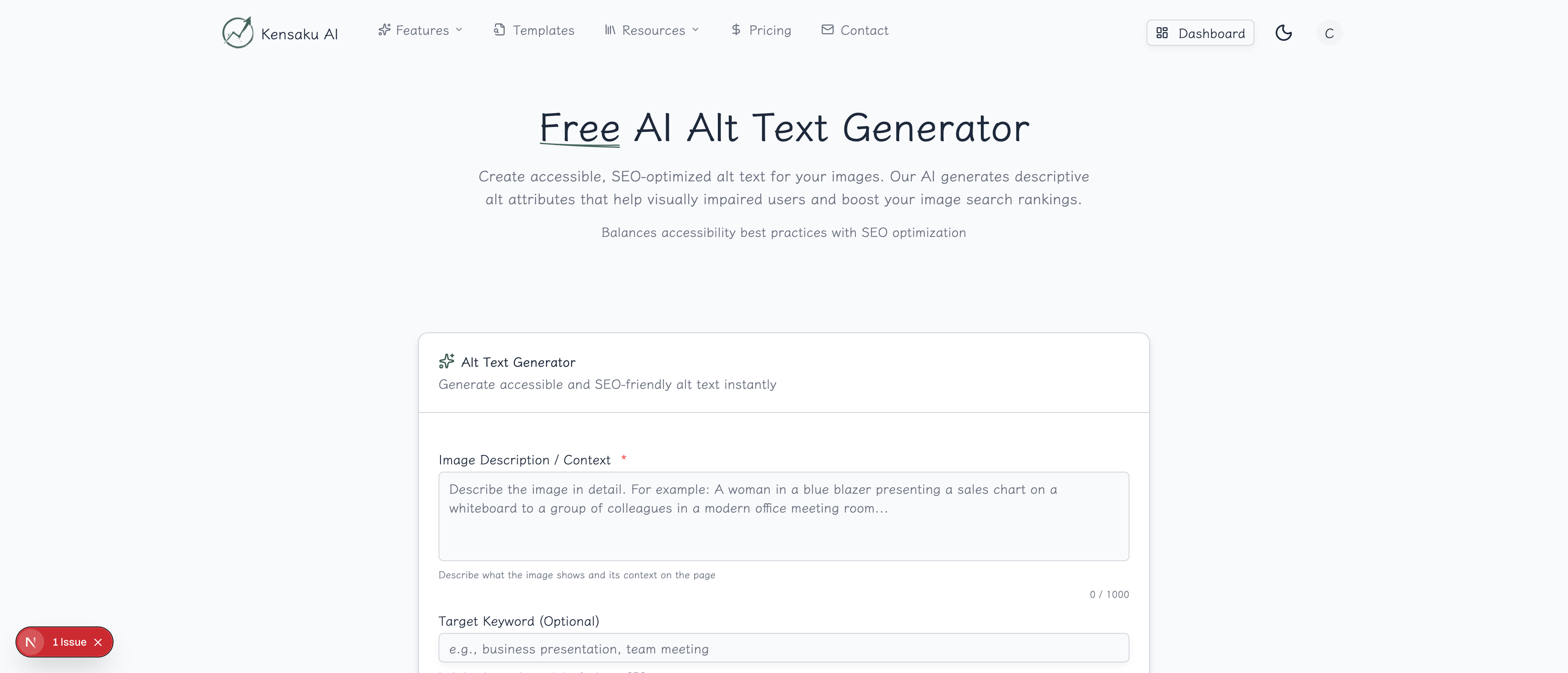 Generate descriptive alt text for images that improves SEO and accessibility. Learn how to use our free AI alt text generator with keyword optimization.