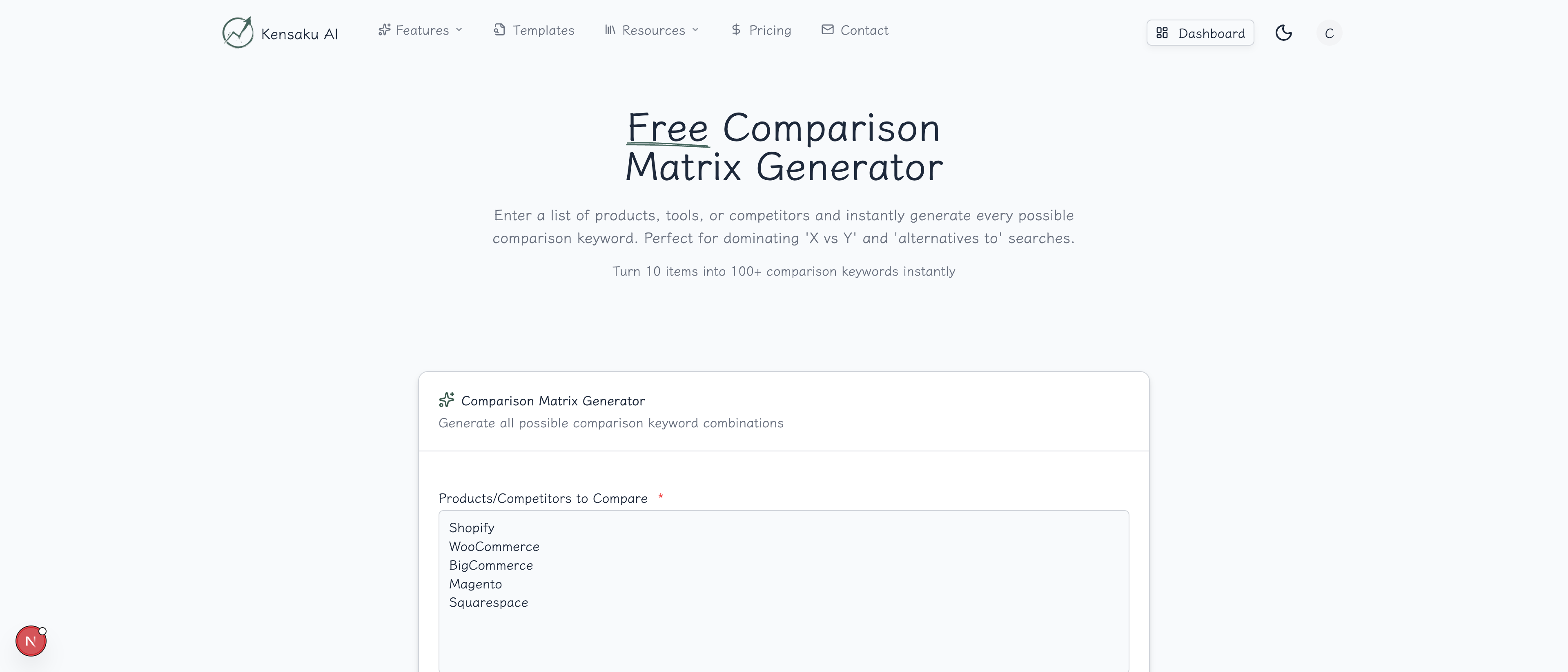 A comparison matrix is a comprehensive list of all possible comparison keywords between a set of products, tools, or competitors. Instead of manually writing out "A vs B", "A vs C", "B vs C"... the matrix generates every combination automatically.